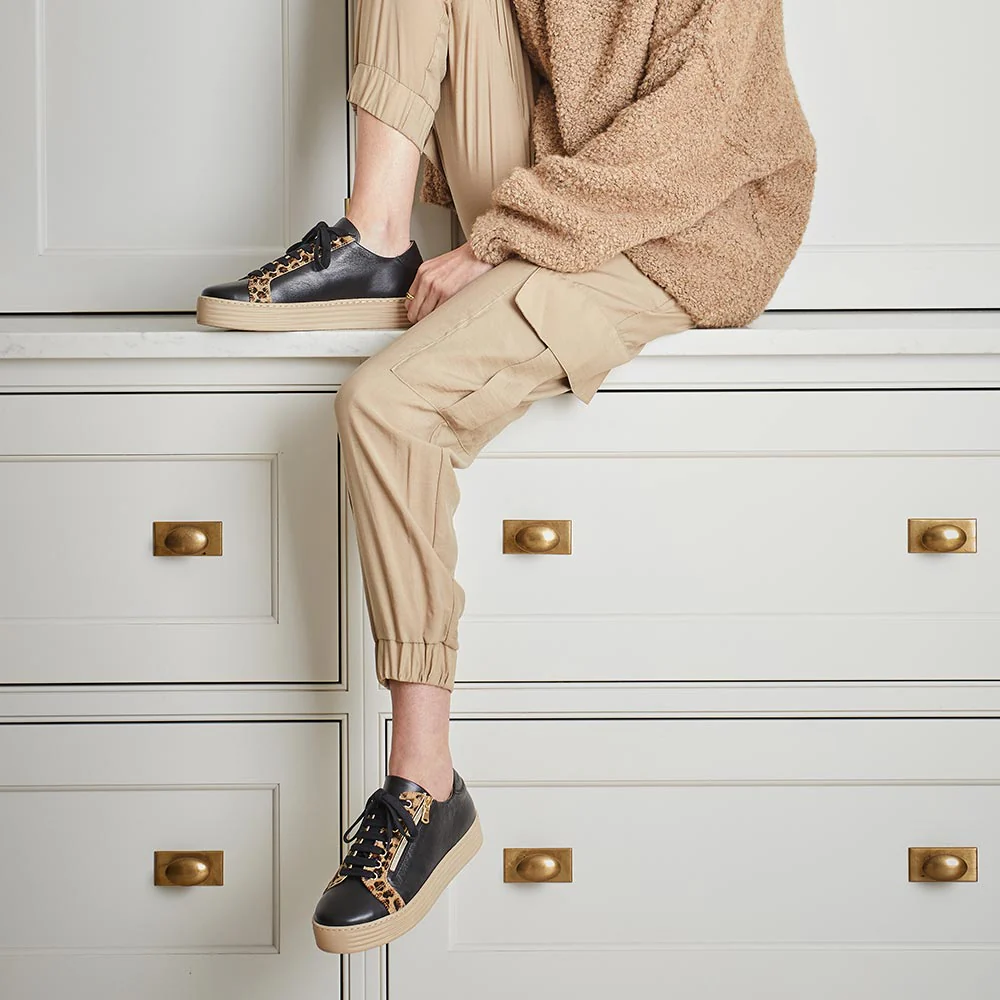Meet your must-have leopard print trainer! Handcrafted in Italy from the finest Black Leather, these comfy Miracle Trainers feature leopard detailing and a metallic zip closure. Our signature anatomically contoured footbed cushions your soles, the spacious toe-box provides a comfortable fit and our Bunion Bed stretch panel perfectly accommodates any footshape.